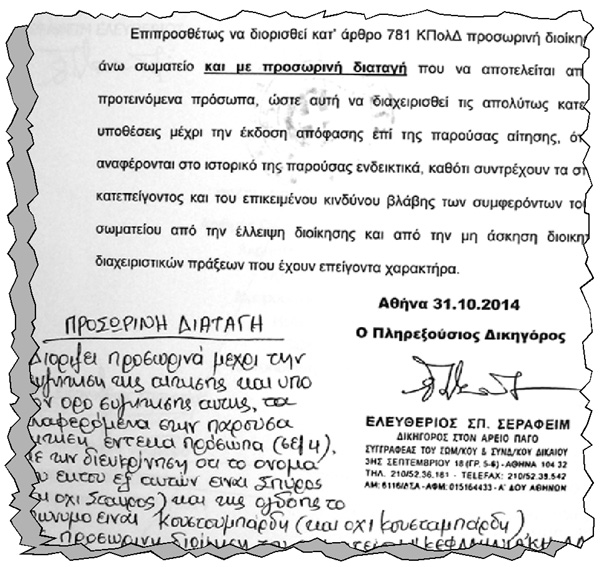 Oι ανωτέρω, με ευθύνη και την επιμέλεια του κ.Γερουλάνου θα κληθούν να συγκροτήσουν σε Σώμα το προσωρινό Διοικητικό Συμβούλιο της Αδελφότητας. Στη συνέχεια, εντός προθεσμίας έξι μηνών από τη δημοσίευση της απόφασης του Ειρηνοδικείου ΑΘηνών μετά την εκδίκαση της Αίτησής του, θα συγκαλέσουν Γενική Συνέλευση για την εκλογή νέου 11μελούς Δ.Σ. και λοιπών οργάνων.