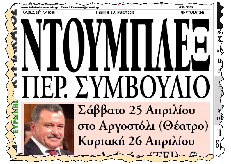 Ντούμπλεξ Περιφερειακό Συμβούλιο θα γίνει σήμερα (9.30’ π.μ.) στο Δημοτικό Θέατρο Αργοστολίου και αύριο (10 π.μ.) στο ΤΕΙ Ληξουρίου, όπως έχει γράψει ο «Η» από τις 2/4/15 (αρ. φ.6035).
