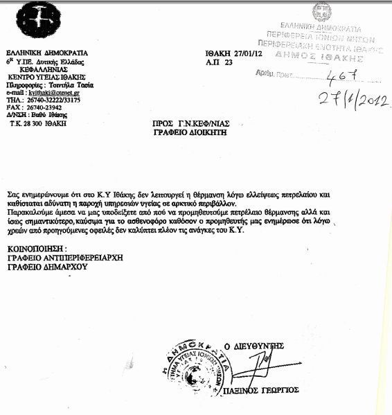 O κ. Παξινός με επιστολή του από τις 27/1 ενημερώνει τον Διοικητή του Νοσοκομείου στο Αργοστόλι κ. Δημήτρη Αυγουστάτο, που είναι υπεύθυνος για την εύρυθμη λειτουργία το Κ.Υ., ενώ την επιστολή κοινοποιεί στα Γραφεία αντιπεριφερειάρχη και Δημάρχου Ιθάκης.
