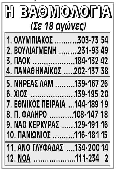 Η επόμενη αγωνιστική (19η): Βουλιαγμένη-Π. Φάληρο, Παναθηναϊκός-ΠΑOΚ, Νηρέας Λαμίας-Oλυμπιακός, Εθνικός-Κέρκυρα, Χίος-Πανιώνιος, ΝOΑ-Γλυφάδα.