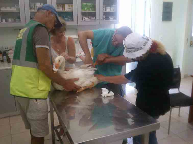 Σήμερα το πρωί ολοκληρώσαμε την επιχείρηση, αφού με την συνδρομή του εθελοντή και μέλους μας κο Peter Lee, καταφέραμε και πιάσαμε τα πτηνά, που σημειωτέον είχαν πάει ξανά στην ίδια νησίδα, και τα πήγαμε στον κτηνίατρο κον. Ψαρρό για τα περαιτέρω… Ηταν ευχάριστο να δούμε ότι τα πτηνά απολάμβαναν το φρέσκο νεράκι που πρόθυμα τα παιδιά που εργάζονται στον Δήμο είχαν ενεργοποιήσει ανοίγοντας τα ποτιστικά συστήματα, ενώ στο χώρο μας περίμενε και η κα Ζερβού Βέρα που μας βοήθησε σημαντικά... Τους ευχαριστούμε πολύ, καθώς επίσης και την κα Βεργωτή Στεφανία τον κον Θανάση και τον κον. Γεωργιλά Παύλο που από την πρώτη στιγμή είναι κοντά μας!
