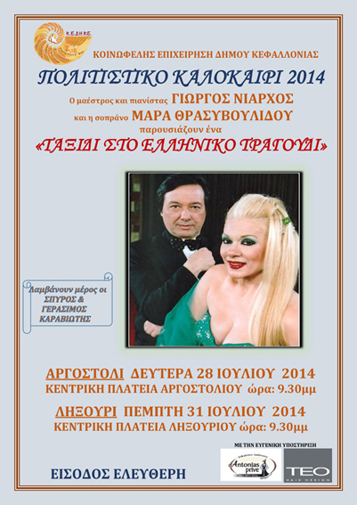 Μεθύριο Δευτέρα στην Κεντρική Πλατεία Αργοστολίου (9.30’ μ.μ.) και την Πέμπτη 31 Ιουλίου στην Κεντρική Πλατεία Ληξουρίου (9.30’ μ.μ.), ο μαέστρος και πιανίστας Γιώργος Νιάρχος και η σοπράνο Μάρα Θρασυβουλίδου θα μας παρουσιάσουν ένα «Ταξίδι στο ελληνικό τραγούδι».